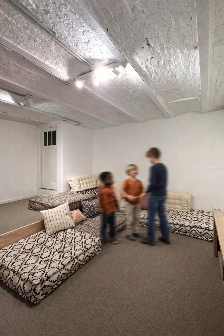 Dans l’habitat partagé « Godefroid », profitez de grands espaces communs, aménagés et meublés avec soin pour offrir un cadre confortable, adapté aussi bien aux moments de partage qu’aux instants de tranquillité. Découvrez ci-dessous des images 3D des aménagements proposés avec le mobilier fourni. En groupe, vous pourrez choisir de les adapter ou de réaménager l’espace selon vos envies.